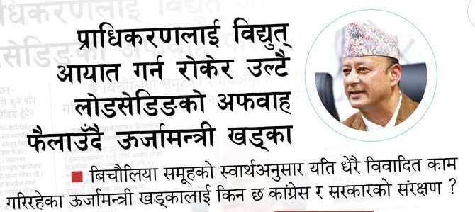 विभागीय मन्त्रीका हैसियतमा ऊर्जामन्त्री दीपक खड्काको दायित्व देशमा लोडसेडिङ हुन नदिने प्रबन्ध गर्नुका साथै त्यसबारे नागरिकलाई आश्वस्त पार्नु हो । तर, प्राधिकरणलाई विद्युत् आयात गर्न नदिएर उल्टै ‘घरघरमा लोडसेडिङ हुँदै छ’ भनेर अफवाह फैलाउँदै छन् ।