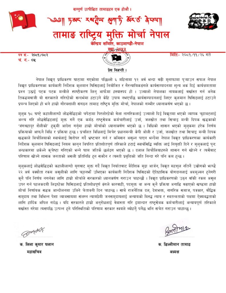 काठमाडौं, नेपाल बिध्युत प्राधिकरणको कार्यकारी निर्देशक कुलमान घिसिङलाई पदबाट हटाउन सरकारले गरिरहेको गतिबिधिलाई नजिकबाट हेरिरहेको तामाङ राष्ट्रिय मुक्तिमोर्चा नेपालले कुलमान घिसिङको पक्षमा विज्ञप्ति जारी गरेको छ |