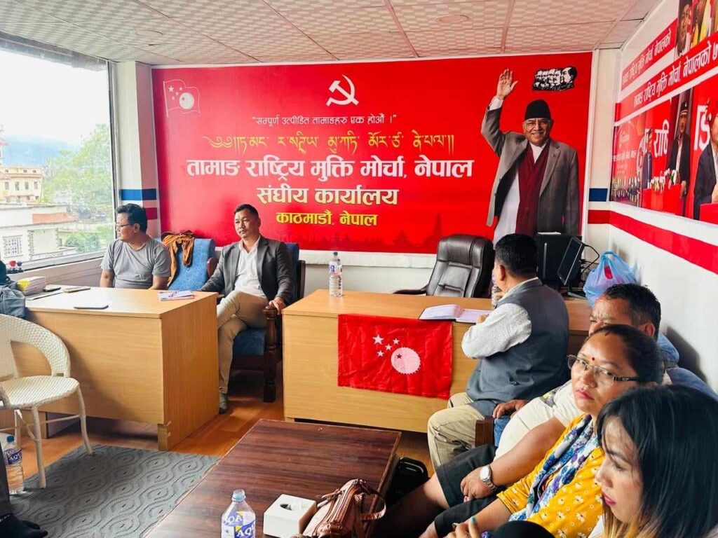 पहिचान सहितको संघियता, जातिय जनसंख्यको आधरमा पुर्ण समानुपातिक सहभागिता, अल्प संख्याकको लागि बिशेस आरक्षण र प्रत्यक्ष निर्बाचित कार्यकारी राष्ट्रपतिको मुद्दालाई फेरि अगाडि सार्दै देश ब्यापी अभियन चलाइ रहेको तामाङ राष्ट्रिय मुक्तिमोर्चा नेपालले आज असोज १० गते मोर्चाको काभ्रे जिल्ला अन्तर्गतका केन्द्रिय सदस्यहरु र प्रदेश कमिटि सदस्यहरुको संयुक्त बैठक मोर्चाको वागमती प्रदेश संयोजक कर्म लोप्साङ तामाङको अध्यक्षतामा बसियो |