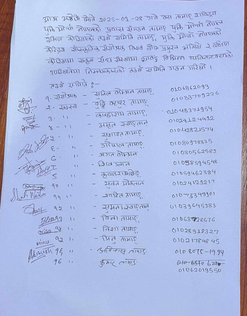 काठमाडौं । नेकपा (माओवादी केन्द्र) निकट तामाङ राष्ट्रिय मुक्ति मोर्चा नेपाल दक्षिण कोरियाको तदर्थ समिति गठन भएको छ । मुक्ति मोर्चाका केन्द्रिय साँकृतिक विभाग संयोजक विश्व दोङको प्रमुख अतिथि र कोरियामा सकृय संघ संस्थामा आबद्ध विभिन्न व्यक्तिहरुको उपस्थितिमा मंगलबार तदर्थ समिति गठन गरेको हो ।